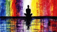Deze afbeelding toont het silhouet van een persoon in een meditatiehouding voor een kleurrijke aquarelachtergrond. De zachte, vloeiende kleuren op de achtergrond symboliseren rust en innerlijke harmonie, terwijl het silhouet zich meditatief concentreert op de essentie. De weerspiegeling in het water onder de persoon versterkt het effect…