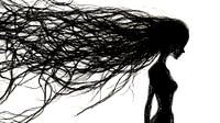 Dit indrukwekkende silhouet toont een mysterieuze vrouw met lang, wapperend haar dat wordt gevangen door de wind. De dynamische beweging van het haar geeft het beeld een krachtige en dramatische uitstraling, terwijl de contrastrijke afbeelding een artistiek en toch minimalistisch effect geeft.