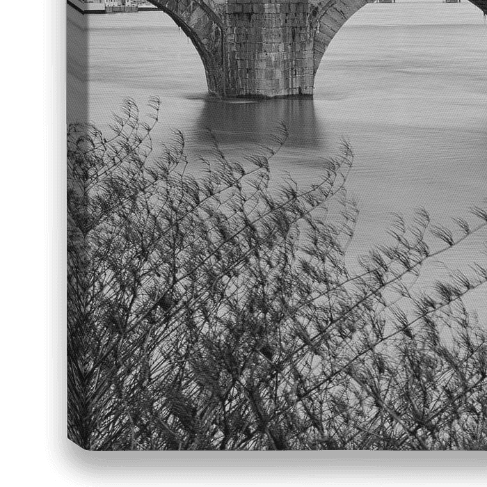 Zwart/wit opname van een dreigende lucht boven de Sint Servaasbrug in Maastricht, een boogbrug uit de 13e eeuw over de rivier de Maas.