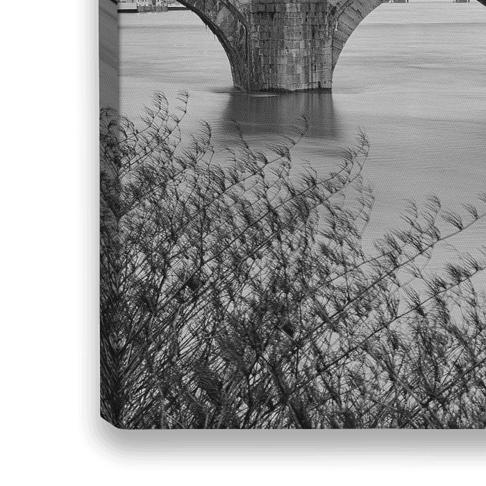 Zwart/wit opname van een dreigende lucht boven de Sint Servaasbrug in Maastricht, een boogbrug uit de 13e eeuw over de rivier de Maas.