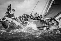 Lemster skûtsje tijdens SKS Skûtsjesilen 2015 op woelig Heegermeer bij Woudsend.