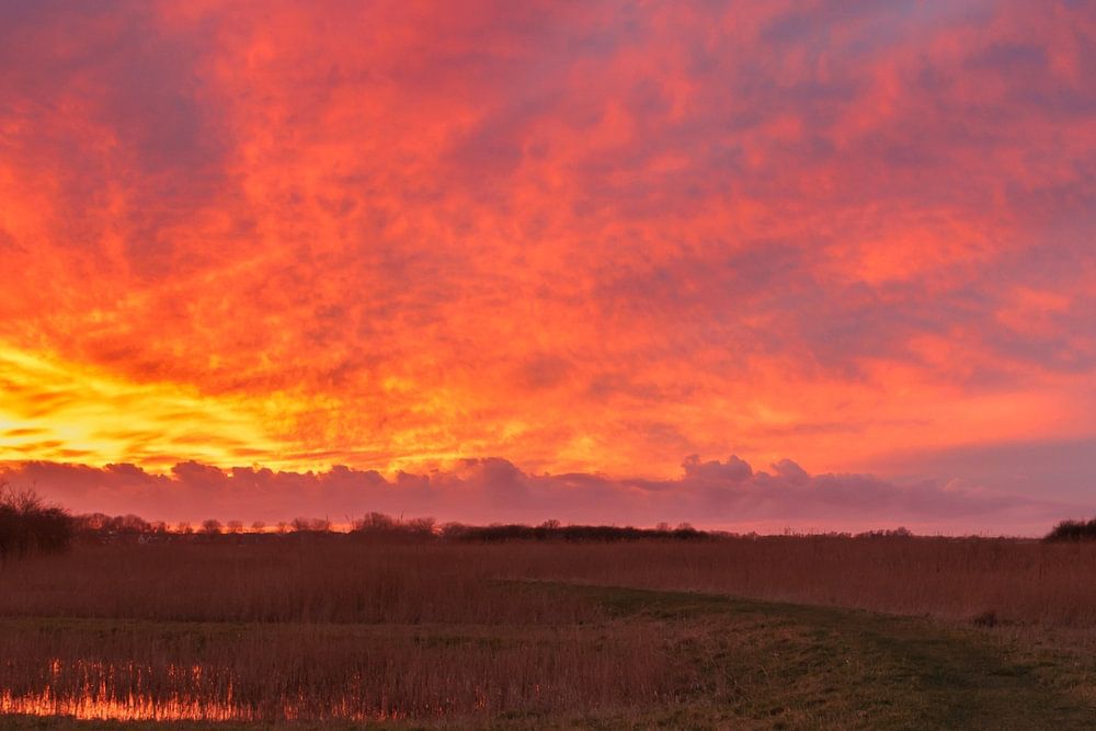 Slechts een paar keer per jaar kleurt de lucht zo onwerkelijk mooi dat het bijna niet echt lijkt. Zo ook deze eerste zaterdag van februari. Na een overwegend bewolkte dag vond de ondergaande zon nog net op tijd een gat in de indrukwekkende wolkenlaag, om vervolgens voor een ware kleurexplosie te zorgen. Dat was een minuut of twintig op en top genieten.