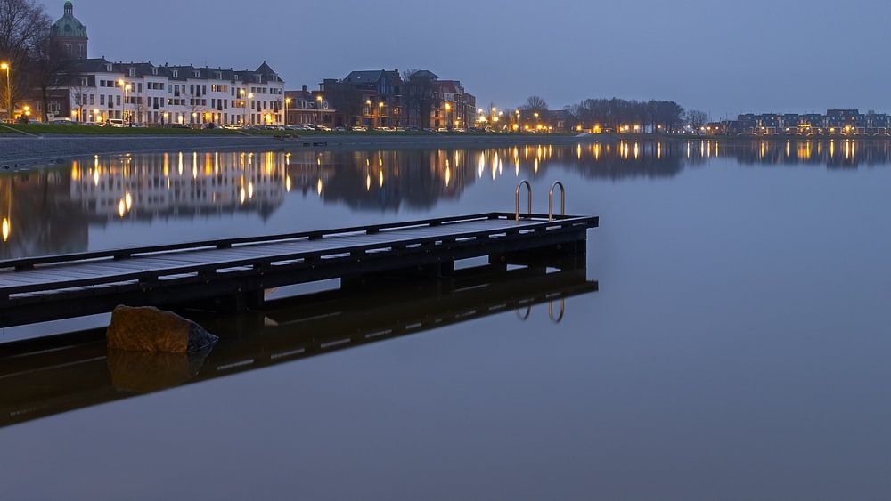 Vanaf de kade bij het stadsstrand van Hoorn heb je een goed zicht op de skyline van Hoorn. Het Markermeer is deze grijze ochtend als een spiegel, waardoor een fijne reflectie ontstaat. De stenen op de voorgrond zorgen voor diepte in de foto, en de pier geeft een prettige kijklijn de foto in.