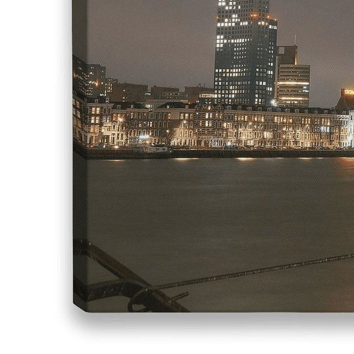 Avondfotografie over de Maas vanaf de Willemsbrug van de skyline van de Kop van Zuid met o.a. de Erasmusbrug (De Zwaan) en de Rotterdam. Door de bewolking weerschijnt het licht van de stad mooi tegen de onderkant van de wolken. Op de voorgrond een stukje van kunst de 'Waslijn',