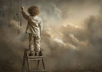 Dit dromerige kunstwerk toont een jong kind dat, hoog staand op een trapje, reikhalzend een van de vele sierlijke sleutels probeert te grijpen. Het tafereel speelt zich af in een mystieke wolkenlucht, waardoor een poëtische sfeer van nieuwsgierigheid en ontdekking ontstaat. Deze muurdecoratie is perfect voor wie zoekt naar…