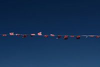 Trots wapperen de Engelse Vlaggetjes in de wind. De slinger vormt tegen de strak blauwe lucht een kleurrijk contrast.