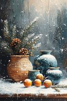 Sneeuw op Sinaasappels - Dit winterse stilleven schilderij toont een sfeervolle compositie met een rieten mand vol met dennenappels en besneeuwde takken, naast elegante blauwgroene keramische vazen en enkele met sneeuw bedekte sinaasappels op een houten ondergrond, allemaal tegen een achtergrond van een besneeuwd…