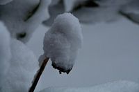 Winter in de Nederlandse tuin. Deze uitgebloeide bloem heeft een hoedje van sneeuw gekregen door de driftsneeuw.