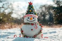 Een vrolijke sneeuwpop, versierd met een kleine kerstboom en kleurrijke snoepjes, verspreidt wintervreugde. Zijn vrolijke ogen en rode hoed stralen vreugde uit terwijl de sneeuw zachtjes om hem heen valt. Dit charmante motief is perfect voor de woonkamer om een feestelijke sfeer en gezelligheid te creëren.