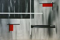 Geometrische voorstelling in grijs zwart en wit met rode accenten