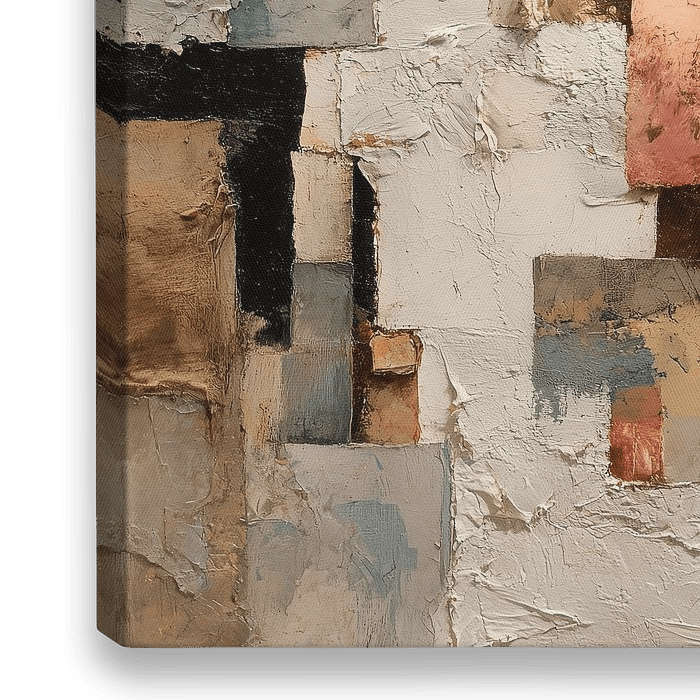 Een abstract kunstwerk met een textuurcompositie van overlappende geometrische vormen tegen een overwegend witte achtergrond. Het kleurenpalet bestaat uit neutrale tinten en aardse kleuren, wat resulteert in een geometrische compositie met een kubistische invloed en een collageachtige, mixed-media-benadering.