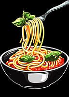 Het motief toont een gestileerde afbeelding van een portie spaghetti in een zwarte kom, geserveerd met een felrode tomatensaus. Een vork tilt wat noedels uit de kom, versierd met verse basilicumblaadjes. De krachtige kleuren en duidelijke lijnen geven de afbeelding een modern en smakelijk karakter. De zwarte achtergrond benadrukt de…