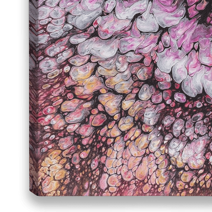 Abstract schilderij in acrylverf op canvas. Flonkerende vormen in rood, oranje, rosé, magenta, geel, bruin, wit en zwart. Kleuren en vormen die doen denken aan een impressionistisch schilderij.
