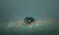 Deze betoverende foto vangt het moment waarop een nieuwsgierige zwarte hondje door een veld van rode bloemen kijkt.