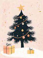 Speelse kerstboomillustratie met warme tinten en cadeautjes in winterse setting