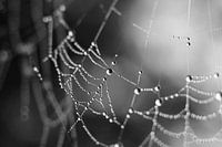 Delicaat spinnenweb bedekt met prachtige dauwdruppels op een mistige herfstochtend. Zwart-wit natuur macro fotografie.