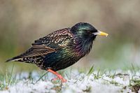 Spreeuw ( Sturnus vulgaris ) in een metallic glanzende fokjurk, verrast door de sneeuw, krijgt koude voeten, wild, Europa.