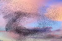 Spreeuwen groep vliegt in een bewolkte lucht tijdens een kleurrijke zonsondergang aan het einde van de dag. Enorme groepen spreeuwen (Sturnidae) in de lucht die bewegen in vormveranderende wolken voor de nacht.