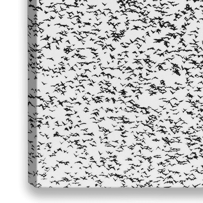 Een grote zwerm vogels in zwart/wit. Duizenden spreeuwen in een grote groep, volbeeld.