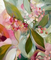 Abstracte bloesem in voornamelijk groen en roze tinten.