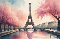 Abstract digitaal werk. Parijs de stad van de liefde en romantiek, wandelen langs de Seine. Sfeer in elk seizoen. De Eiffeltoren mag niet ontbreken. Zachte en warme kleuren met de bloeiende bomen. Oude stad in een modern jasje