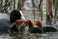 Thrid assignment with the competition "de Beste foto". I saw this coot with it little ones. They were hiding behind the reeds. I was sitting as low as possible and genlty waiting. After about 10-15 minutes they all came out and mother was feeding them. With this photo, I became first.