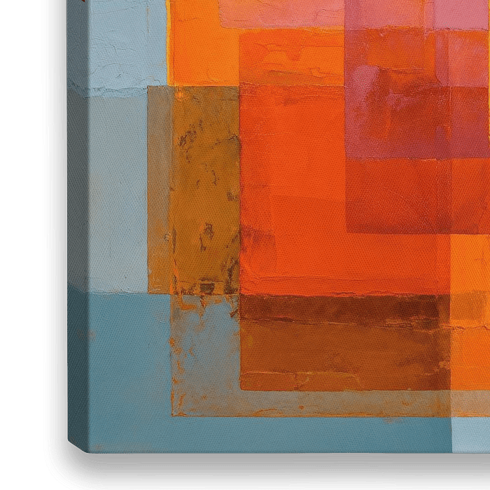 Een abstract kunstwerk met een dynamische compositie van overlappende geometrische vormen, voornamelijk rechthoeken en vierkanten die variëren in transparantie, wat een gevoel van diepte en gelaagdheid creëert. De compositie geeft een algeheel harmonieus energiek gevoel.