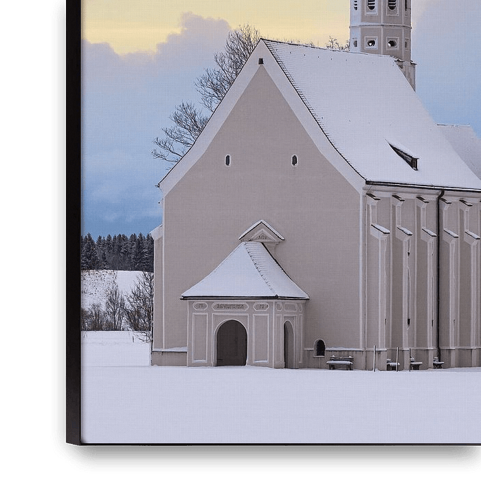 Winter en zonsondergang bij de St Coloman kerk, gelegen bij Hohenschwangau, nabij Füssen, in de Allgäu, in Beieren, zuid Duitsland.