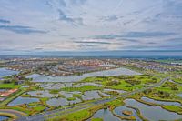 De woonwijk Stad van de Zon gezien van boven. De energiezuinige woonwijk met zonnepanelen in het zuiden van Heerhugowaard tegen Alkmaar aan.