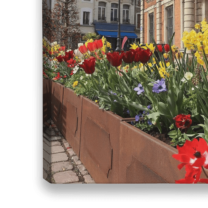 Kleurrijk lentegezicht op de efemere tuinen en het 18e-eeuwse stadhuis van Boulogne-sur-Mer, aan de prachtige Opaalkust van Noord-Frankrijk. Voorjaarsbollen van tulpen en narcissen bloeien op de voorgrond.