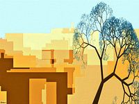 (Kunst)werk met als onderwerp (stedelijk)landschap, skyline, architectuur. Digitale kunst. Expressionisme. Geabstraheerd.