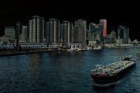 Een digitale bewerking van een afbeelding  met zicht op de Boompjes in Rotterdam met op de rivier een varend binnenvaart schip. De Boompjes is een Rotterdamse  boulevard langs de Nieuwe Maas, tussen de Erasmusbrug en de Willemsbrug.