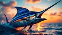 Een majestueuze marlijn glijdt majestueus door het diepblauwe water van de oceaan terwijl de zon langzaam in de horizon zakt. De lucht gloeit in droomachtige kleuren en verandert in een prachtig schilderij van fel oranje, zacht roze en diep paars. Het licht van de ondergaande zon wordt weerkaatst op het glanzende lichaam van de marlijn,…