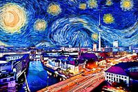 “Starry Berlin” is een levendig en kleurrijk kunstwerk dat de iconische stijl van Sterrennacht van Van Gogh combineert met de moderne skyline van Berlijn. Onder de draaiende sterrenhemel schittert de stad met haar herkenbare gebouwen, waaronder de Fernsehturm, die in dit werk een opvallende plaats inneemt.