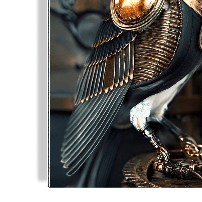 n een futuristische setting, te midden van een met koper beslagen interieur, siert een unieke creatie de ruimte: de steampunk duif. Met haar veren doordrenkt van de glans van oud brons, rust ze majestueus op een mechanische tak, haar bronzen vleugels uitgespreid als een eerbetoon aan vervlogen tijden.