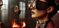 Over ‘Steampunk vrouw met gloeibril in werkplaats’ van Frank Heinz