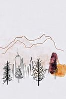 Deze abstracte, minimalistische illustratie toont een stadslandschap dat zachtjes lijkt op te doemen uit een gestileerd bos. Delicate lijnen en zachte aquareloppervlakken smelten samen tot een harmonieuze compositie waarin stedelijke structuren en natuurlijke elementen op gelijke voet naast elkaar bestaan.