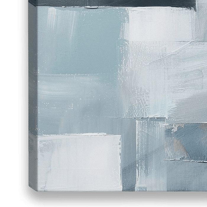 Stedelijk - Dit abstracte schilderij bestaat uit overlappende rechthoekige vlakken in een palet van voornamelijk grijze, witte en blauwe tinten, met opvallende accenten van oranje die een gevoel van diepte en textuur toevoegen.