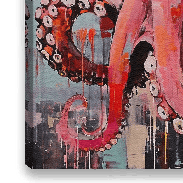 Een levendige octopus strekt zijn tentakels uit tegen een dynamische stedelijke achtergrond, waarbij de grenzen tussen de onderwaterwereld en de stad vervagen. Het roze palet geeft de scène een dromerige kwaliteit, terwijl de abstracte elementen de fascinatie voor het onbekende benadrukken. Dit beeld vangt de octopus in een moment van…