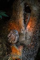 Steenuil ( Athene noctua ) in het mooiste vroege ochtendlicht op zijn favoriete plek in een oude knotwilg, wildernis, Europa.