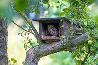 Steenuiltje in uilenkast in boomgaard voor de dijk in het Land van Maas en Waal