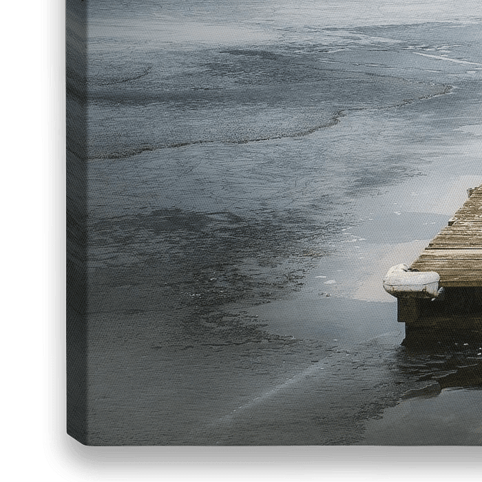 Opname van de aanlegsteiger in het bevroren meer van recreatieplas De IJzeren Man in Vught, provincie Noord-Brabant.