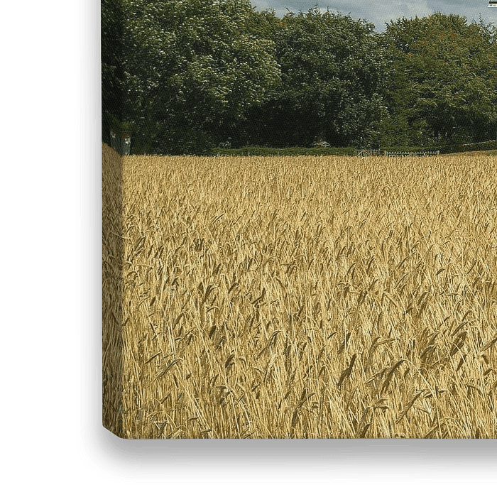 De stellingkorenmolen De Windhond Soest gefotografeerd tegen blauwe lucht met wolken, op de voorgrond een graanveld. Een Oudhollands plaatje.