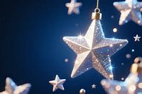Het motief toont stralende kerststerren met fijne glitter op een diep donkerblauw als stijlvolle achtergrond, ontworpen als een hoogwaardige 3D-rendering voor feestelijke toepassingen. Verschillende sterren van verschillende grootte zweven ruimtelijk voor het oppervlak; hun oppervlakken zijn gefacetteerd of licht gebogen en weerkaatsen…