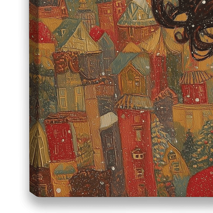 Stijl en penseelvoering: het is een surrealistisch, illustratief portret — een mix van pop-surreal en hedendaagse kerstillustratie. De penseelstreken zijn zichtbaar, vooral in de muts en sjaal waar warme oker- en oranje-variaties golven alsof het textiel ademt. In het haar liet ik krullende, donkere lokken spelen met de wind; kleine, lichte accenten in het haar geven de illusie van beweging en vangen sneeuw. De huizen zijn met fijne, warme lijnen geschilderd; ze zijn gedetailleerd genoeg om knusheid te suggereren maar eenvoudig genoeg om het gezicht het centrum te laten blijven.