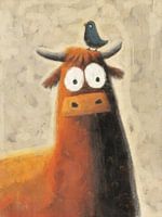 Een nieuwsgierige stier kijkt met grote ogen recht vooruit, terwijl een klein blauw vogeltje vrolijk op zijn hoorns zit. De zachte, pastelachtige achtergrond en vriendelijke vormen maken dit duo ideaal voor de kinderkamer. “Stier & Pieper” brengt een speelse sfeer en nodigt uit tot vrolijke boerderijavonturen en leuke bedtijdverhalen.