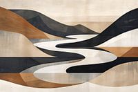 Dit elegante kunstwerk laat een subtiele samenvloeiing van natuur en abstractie zien. De vloeiende lijnen en gebogen vormen herinneren aan de serene beweging van een rivier die zich een weg baant door een landschap. De monochrome kleurenpalet, bestaande uit aardse tinten bruin, beige en zwarte accenten, roepen een kalme, aardse…