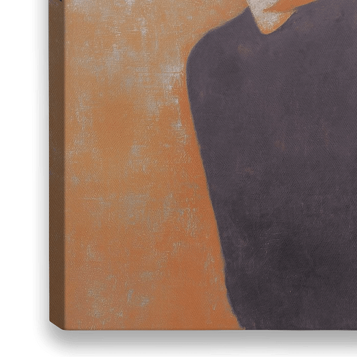 De compositie werkt doordat de twee dominante elementen elkaar opzoeken en toch uit elkaar blijven: het witte profiel wijst omhoog met gesloten ogen, de oranje haarboog omsluit en beschermt, de donkere schouderpartij onderin (bijna een schaduwvlak) houdt het beeld geankerd. In termen van beeldtaal is dit een vrouw portret schilderij dat heel zuiver speelt met vorm en kleur: weinig informatie, maar elke keuze klopt — van de afgeronde haarlijn tot de lichte kin. Het schilderij nodigt uit tot stil worden; niet door dramatische gebaren, maar door eenvoud en kleur. Voorwiezoektnaareeningetogenvrouwschilderijmetprofielenopvallendoranjehaar,isditwerkprecieszosprekendalshetstilis.