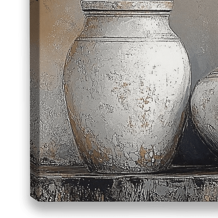 Deze kunstwerk toont een stille maar fascinerende schoonheid van aardewerk vazen en een takje met zachtroze kersenbloesems. De ruwe maar warme materialen en tinten van de vazen vormen een mooi contrast met de breekbare maar levendige bloesems - een metafoor voor de vergankelijkheid van de natuur en de duurzaamheid van kunst.