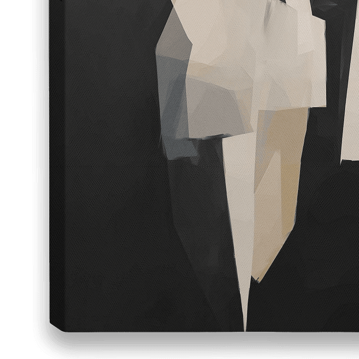 Twee figuren, geabstraheerd en samengesteld uit een serie hoekige, overlappende vlakken tegen een donkere achtergrond. Een verfijnd en ingetogen kleurenpalet van zwart, wit en gradaties van beige.